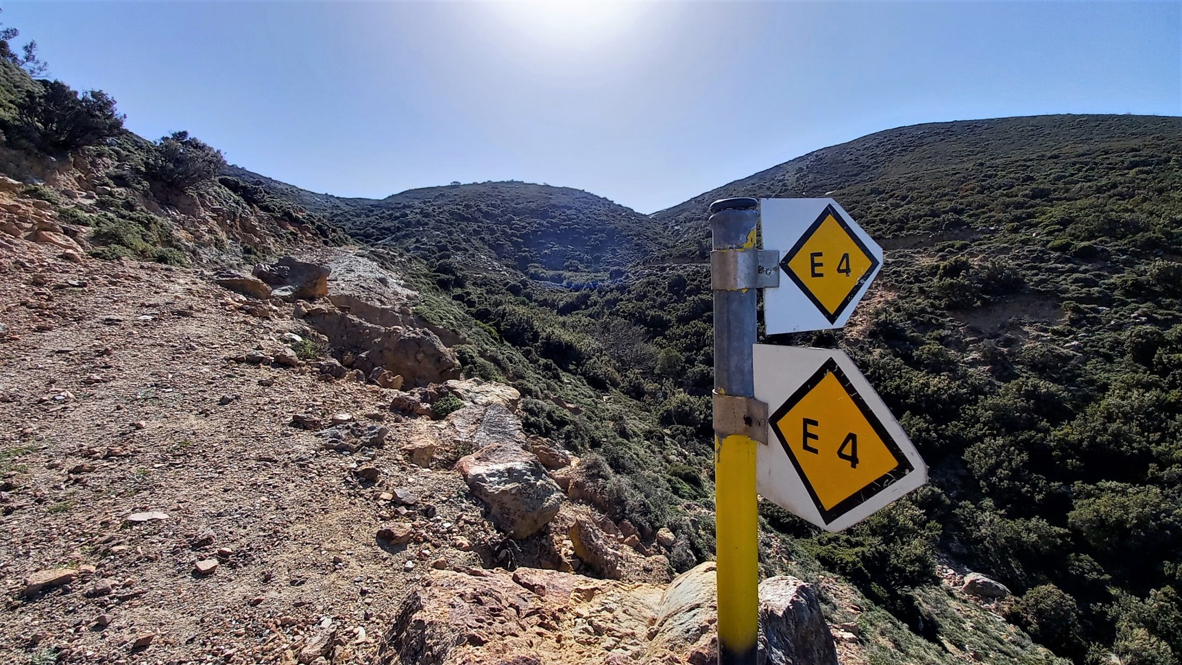La randonnée elle-même commence après avoir passé le village alors que nous nous retrouvons en pleine nature, loin des endroits fréquentés et avec des vues imprenables sur la région ; la baie de Rethymnon au nord, les Montagnes Blanches à l'ouest ou le Psiloritis au sud. Nous empruntons les chemins de bergers mais aussi une partie du E4, le sentier de randonnée européen. Au cours de cette boucle de 11kms environ, nous traversons plusieurs vallons qui nous permettront d'avoir tantôt des vues très dégagées en hauteur, tantôt de nous retrouver au milieu de la végétation sauvage ou des vignes. D'expérience, les seuls êtres vivants croisés sont soit des moutons ou des chèvres, soit leurs bergers car nous sommes sur leurs terres de travail! Et qui sait ? Avec un peu de chance, nous serons peut-être invités par l'un d'entre eux rentrant du travail, à boire un raki ou goûter du fromage frais du jour avec lui ?! Une des magies des randonnées et de l'hospitalité en Crète...