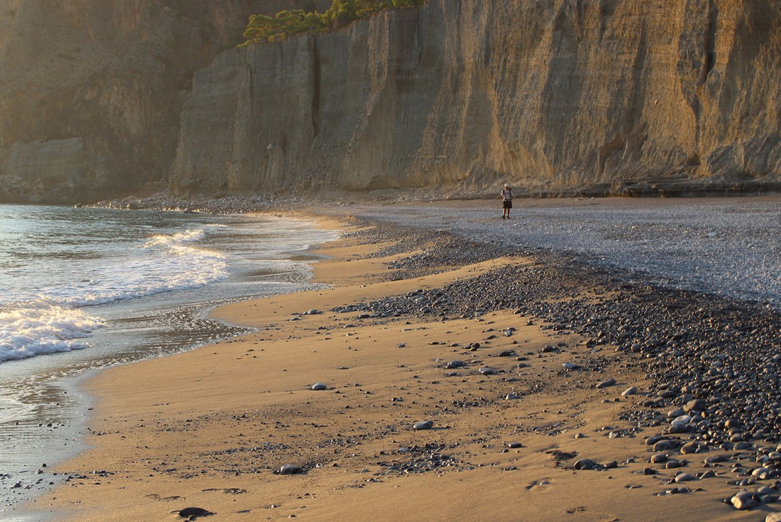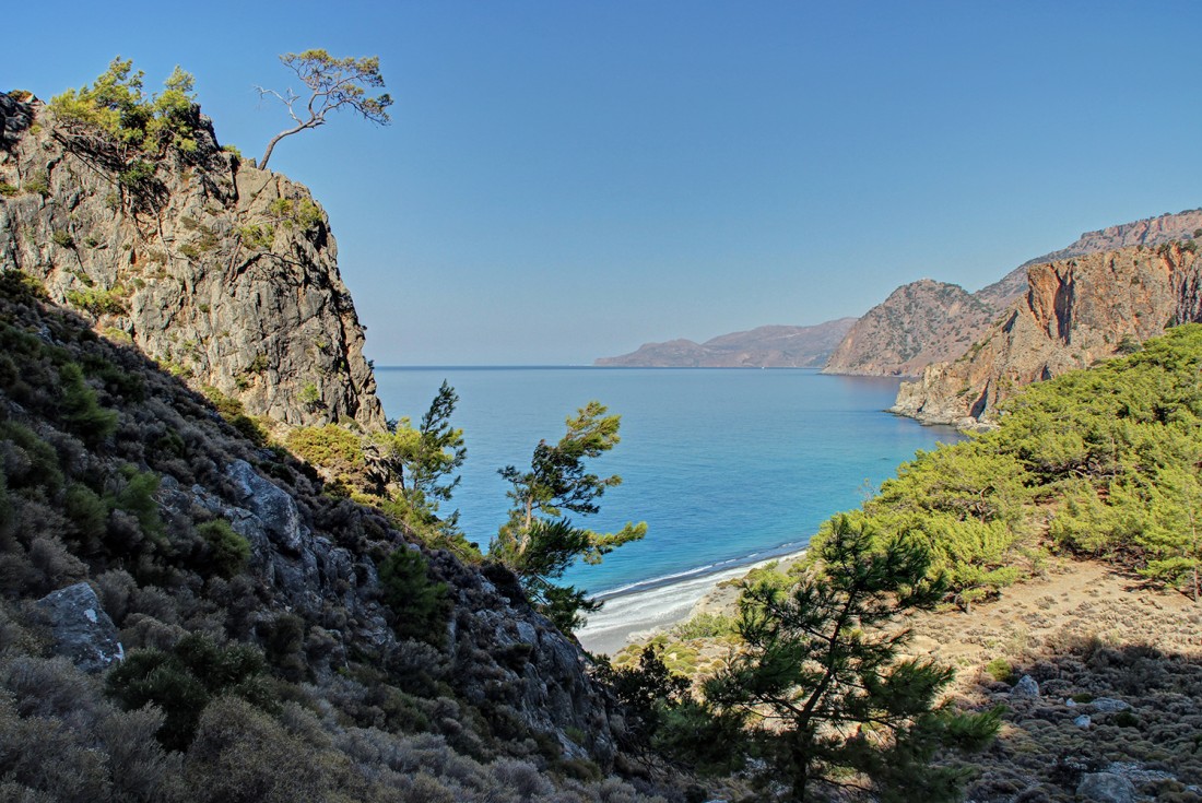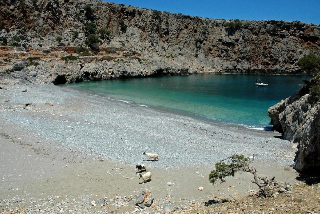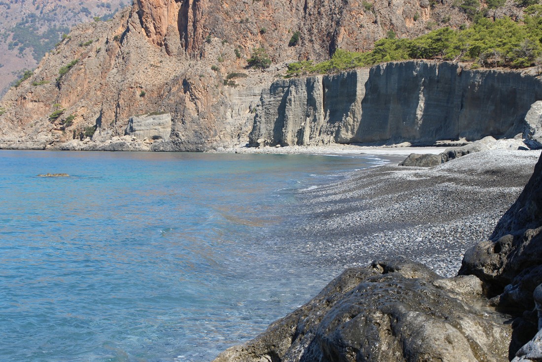 The location of the magnificent secluded beach “Domata” is 7km east of Sougia and 58 km south of Chania. At the beach, ends the wild and rugged gorge of Klados. The water flowing in the area has created a unique natural monument on the beach. The beach is magnificent with fine pebblesand crystal clear blue waters. If you dig the sand, you may find fresh water. Since in the region around the beach, there are no mini markets or other shops, you should remember to bring with you everything you may need. The pine trees of the beach offer the shade that you need. “Domata” is one of the best secret beaches, still kept unspoilt, due to its isolated position. In this paradise beach will only be you, the sea, the sun and the pines. You may access “Domata” via the E4 path starting from Sougia, going east and ending to Agia Roumeli (3 -4 hours hiking). However, you should keep in mind that the coast is very steep and dangerous, as the trail ascends the mountain at an altitude of up to 700m.