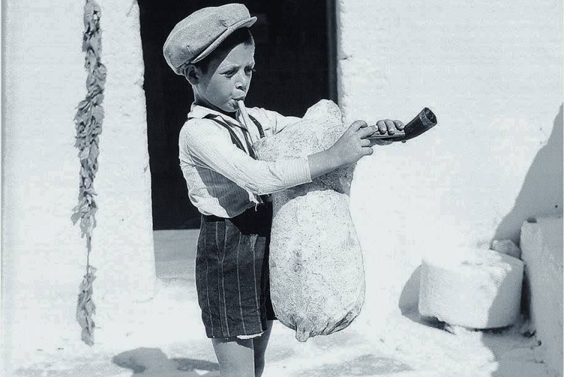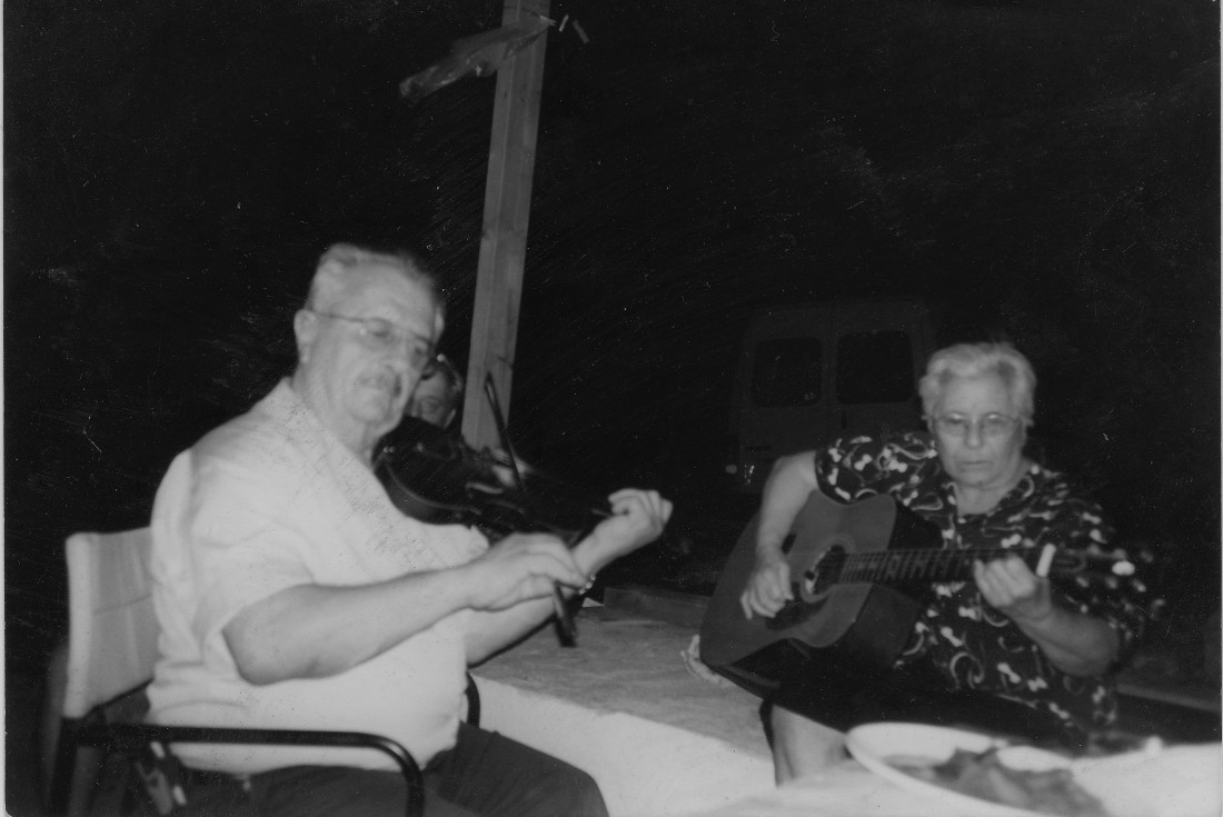 The guitar (today an instrument of folk music in many countries) was gradually formed in Western Europe, from the Middle Ages to the 19th century). Although known in Crete since the time of the Venetian occupation, it is used only in areas of the prefecture of Lassithi, as a "fold", a purely accompanying instrument of the violin. Today, its presence in the provinces of Sitia and Ierapetra with the rich violin tradition is strong. The photo captures Mr Pavlos Exouzidis and his wife, Irene, from Sitia (prefecture of Lassithi).